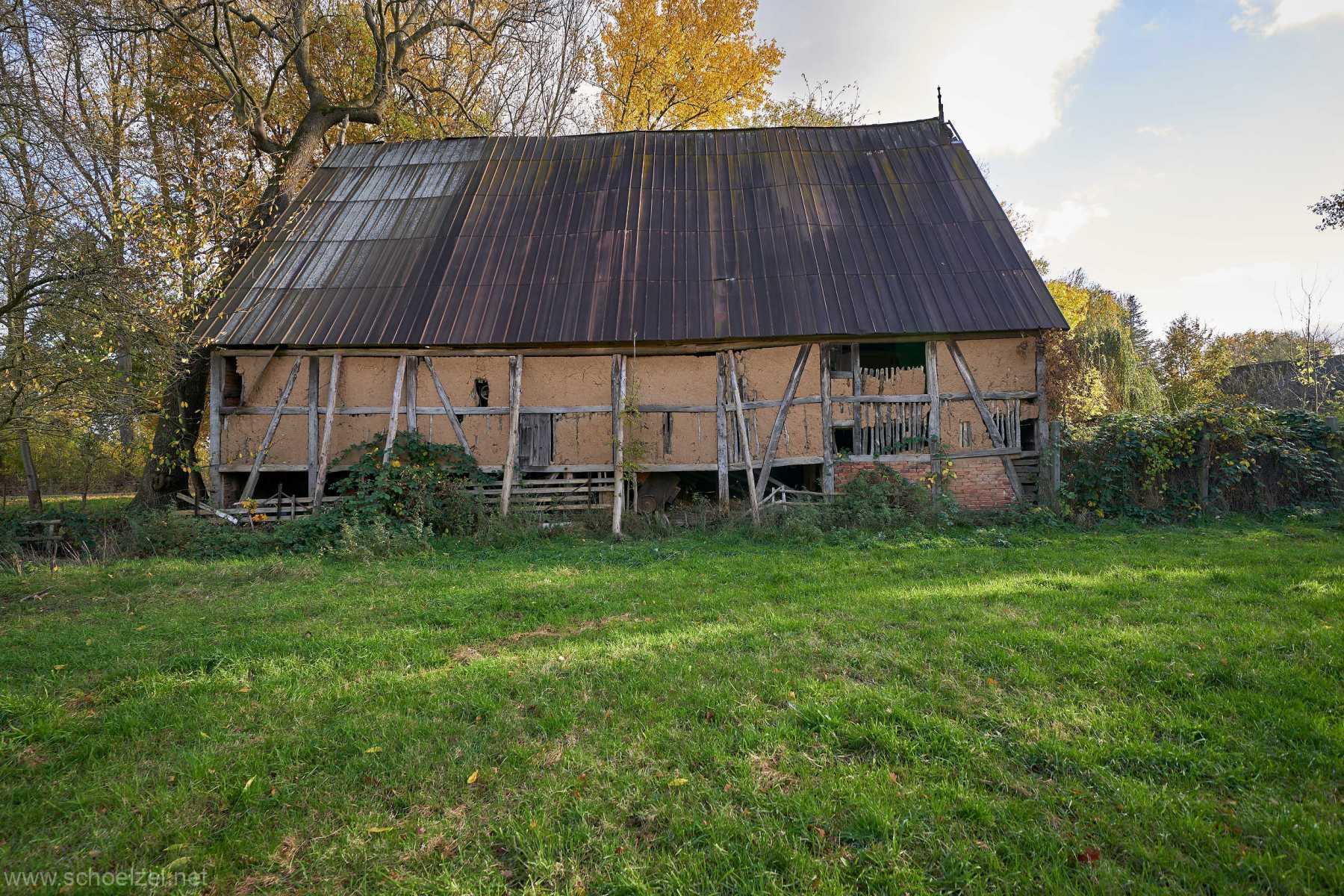 Wer vom Rundling Gühlitz nach Satemin fährt und am Ortsschild nach rechts schaut, der sieht sie. Die alte Scheune. In den 70er Jahren des letzten Jahrhunderts haben ihre damaligen Besitzer, die Familie Gefers, die Landwirtschaft aufgegeben. Und seither wartete sie. Und nahm Schaden. Es regnete durchs Dach, die Lehmgefache fielen raus, das Fundament bröckelte. Aber sie stand noch. Im Herbst 2020 haben wir uns entschlossen die Scheune zu kaufen, sie zu erhalten und ihr ein neues Leben zu ermöglichen. Wir haben mit tatkräftiger Hilfe von Nachbarn aufgeräumt. Der Zimmerer hat mit Notsicherungen Dach und Aussenwände stabilisiert.