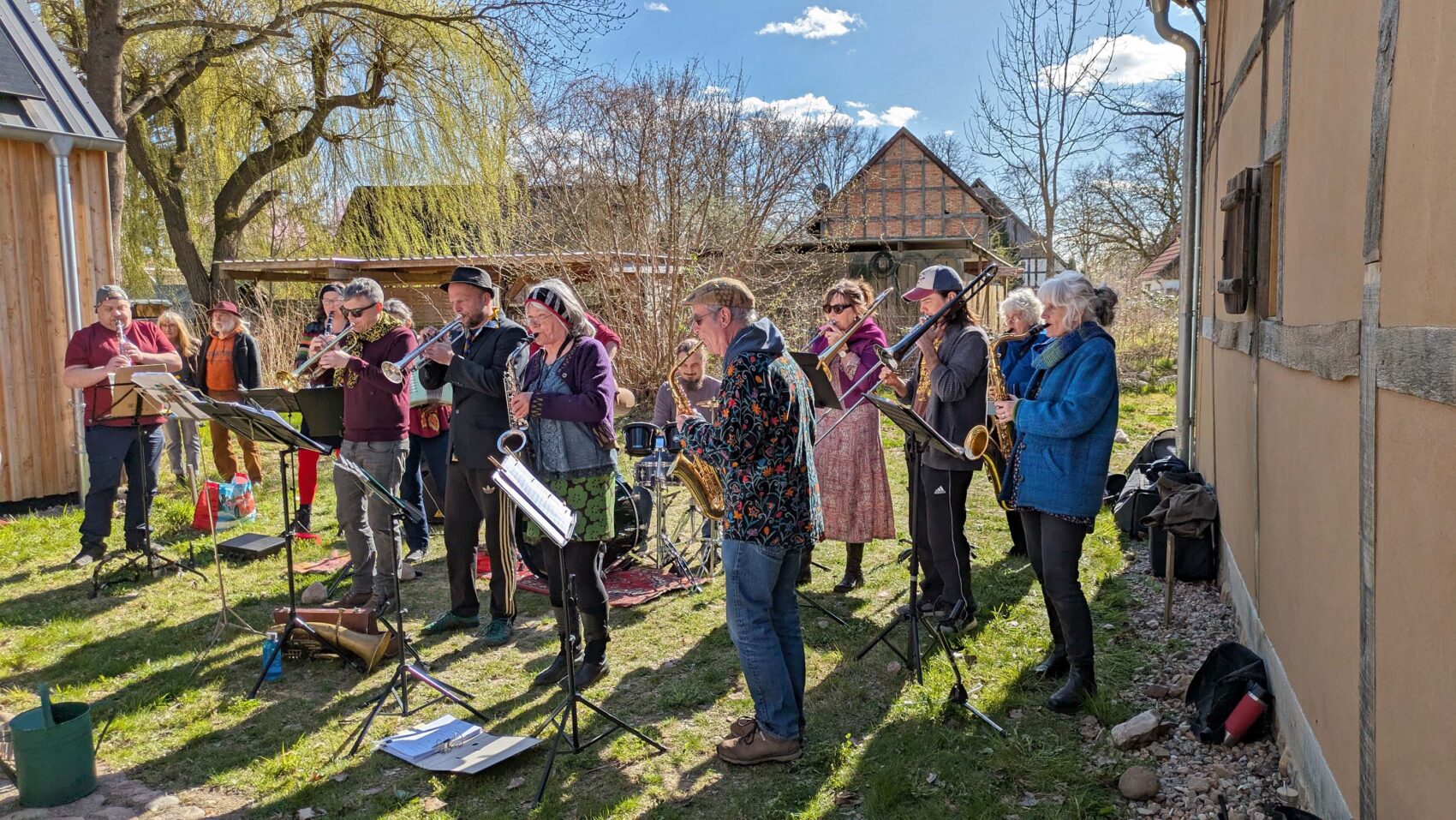 Leider haben sich die Wetterprognosen für das kommende Wochenende verschlechtert. Darum wird das Konzert mit „Volle Kanne“ am Samstag um 16 Uhr in der Alten Scheune Satemin stattfinden und nicht auf dem Hof. Wir räumen die Scheune aus und schaffen Platz für die Band und das Publikum.„Volle Kanne“, das ist SkaLatinBalkanPop mit französischer Note. Humor, Energie und bewegende Musik für gute Laune. Kraftvoll, Mitreißend, Laut. Strassenmusik und Fanfarenklänge, 15 Musikerinnen und Musiker. Schlaginstrumente, Akkordeon und ganz viele Holz- und Blechbläser.
